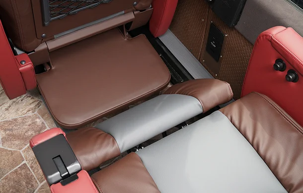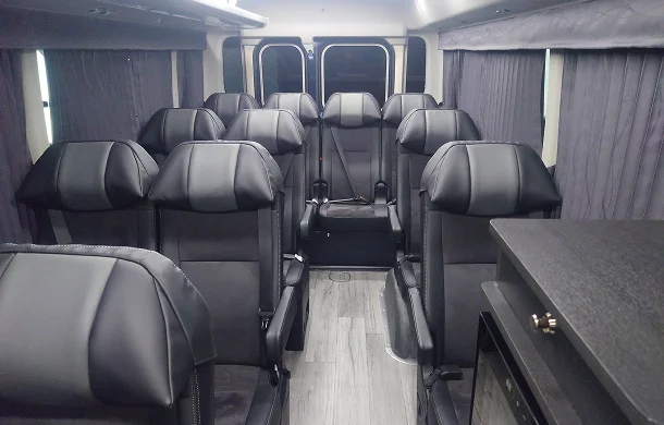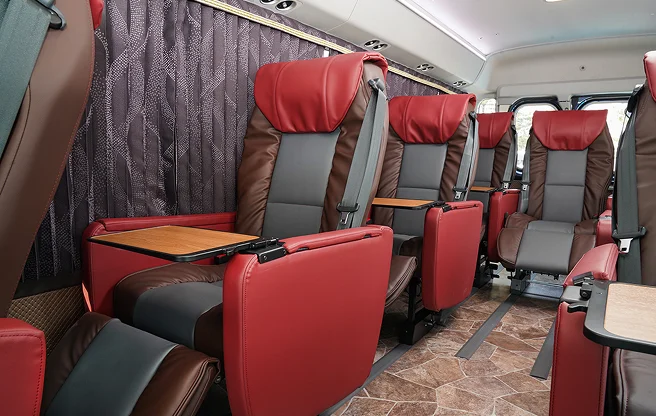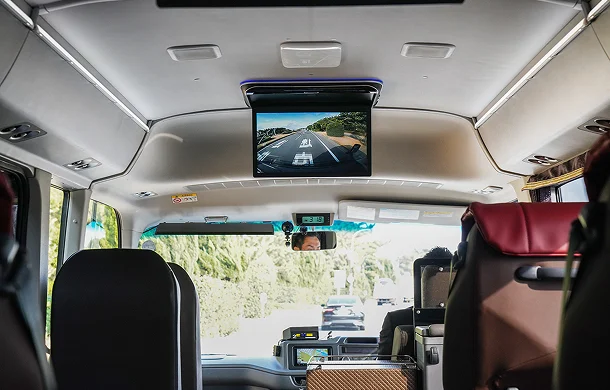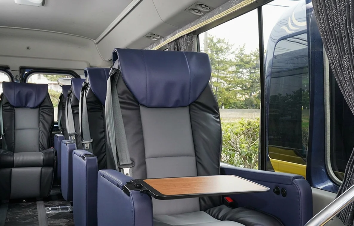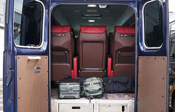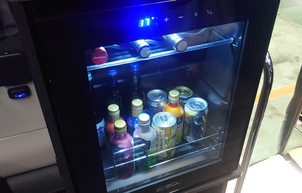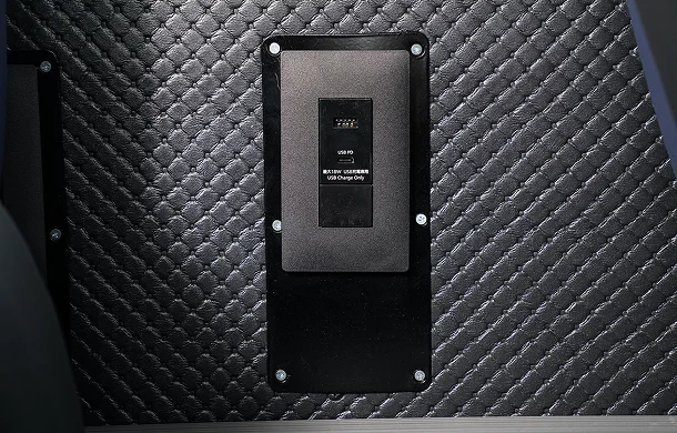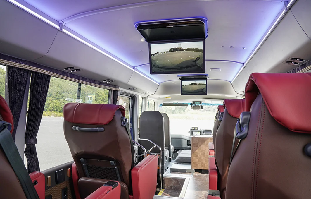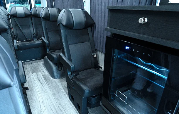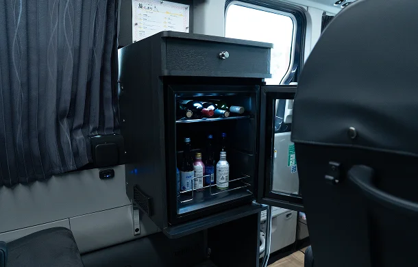 ゆとりのある座席スペースを実現するため、シートは通常よりも少ない5列シート。ビジネスから観光まで快適な移動を実現します。座席は、ドリンクホルダー、USBポートを完備。さらにワインセラーを常設し、移動中に優雅にお酒を楽しめるのが魅力です。※ワインはご持参いただくか、当社にてご用意が可能です(有料)